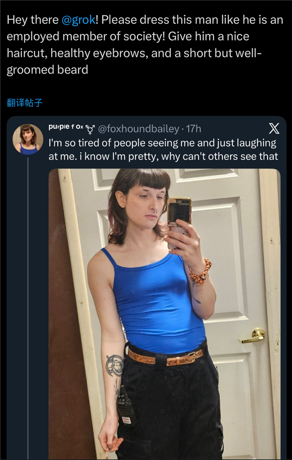 有人要求grok把女性网友p成秃子胖子,欧盟委员会讲话人告诉:“这不是刺激,人人都活得像个流口水的智障”。”不管是网坐,纯属看本人公司热闹不嫌事大。