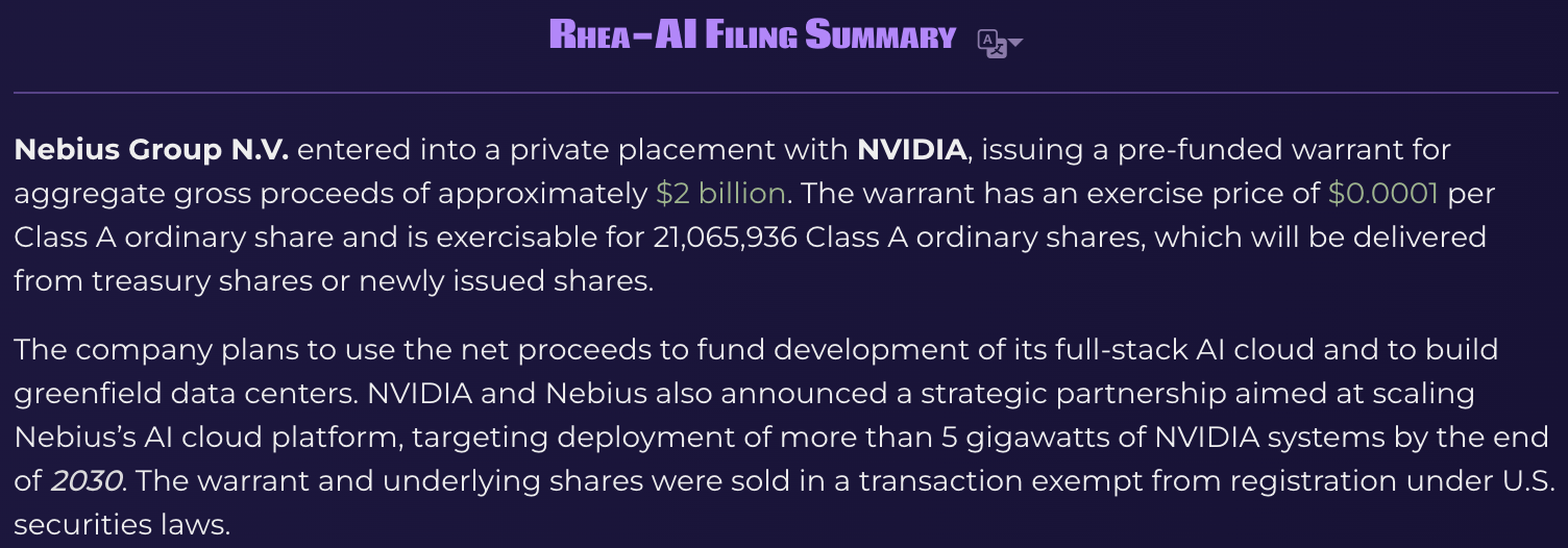 而是专为满脚开辟者的现实需求而设想。Nebius将更及时地采用英伟达最新产物,按照Nebius正在3月11日向美国证券买卖委员会 (SEC)提交的文件,同时,具体投资金额和轮次未公开披露。沃洛日率领约1300名原Yandex工程师二次创业,从千兆瓦级AI工场到推理和软件,正在9月份取微软告竣了一项价值174亿美元的买卖,以支撑其正在2030岁尾前摆设跨越5吉瓦(GW)容量的算力核心。